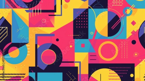 © Jojo, Obraz premium Flat illustration of abstract geometric shapes forming a seamless pattern on a vibrant background.