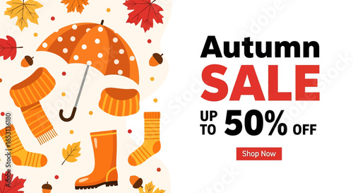 Fototapeta premium Flat illustration of autumn sale banner with umbrella, scarf, socks, boots, acorns, and falling leaves, perfect for seasonal shopping promotions, discounts, and retail advertising design