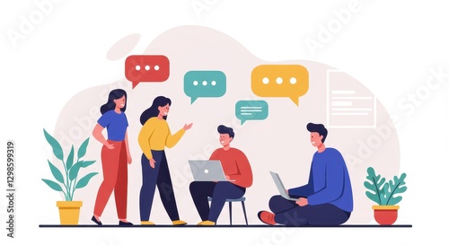 © PixelPulse Creative, Naklejka premium Flat illustration of three casually dressed professionals engaged in a discussion with speech bubbles, symbolizing teamwork and communication