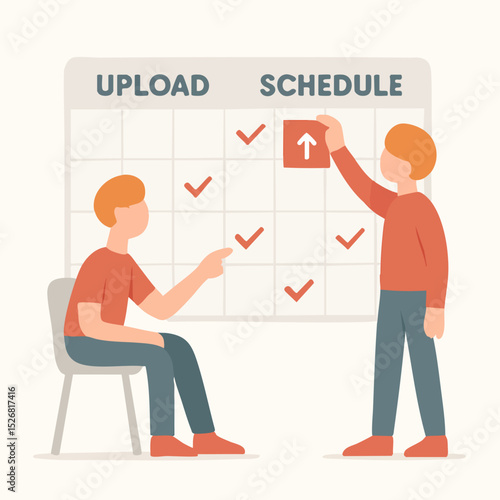 © logo, Obraz premium Flat Illustration of Two People Planning an Upload Schedule Calendar