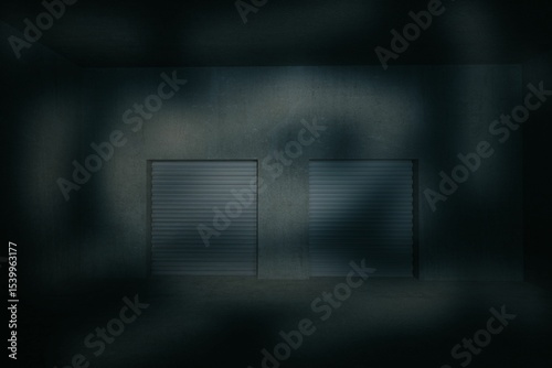 Fototapeta premium Flat illustration showing two closed metal roll-up doors in dim concrete warehouse, shadows casting