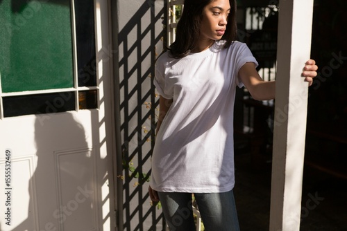 © vectorfusionart, Naklejka premium Flat illustration showing woman standing in doorway casting lattice shadows over door and vine