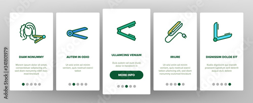 © vectorwin, Naklejka premium Flat Iron Equipment Onboarding Icons Set Vector. Flat Iron Hairdresser Device, Appliance For Beauty Hair, Woman Make Coiffure With Tool Illustrations