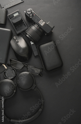 © splitov27, Naklejka premium Flat lay composition of Modern black gadgets and accessories on dark black background. Top view.