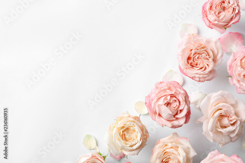 Fototapeta premium Flat lay composition with beautiful roses and space for text on white background