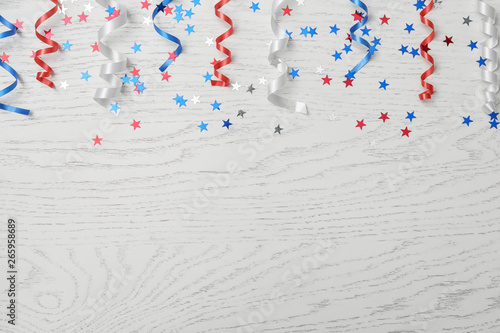 © New Africa, Fototapeta premium Flat lay composition with colorful party streamers on wooden table, space for text. USA Independence Day