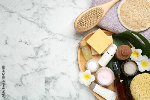 © New Africa, Fototapeta premium Flat lay composition with different body care products on white marble table. Space for text