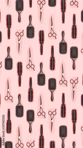 Obraz premium Flat lay composition with hairdresser set on pink background. Barber set with tools and equipment: scissors, combs and hairclips. Hairdresser and beauty salon service. Seamless pattern