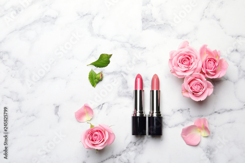 Fototapeta premium Flat lay composition with lipsticks, roses and space for text on marble...