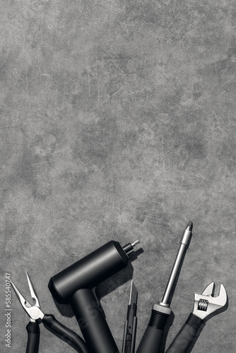 © LanaUst, Naklejka premium Flat lay composition with set of home repair tools on grey stone background. Top view pattern with copy space.