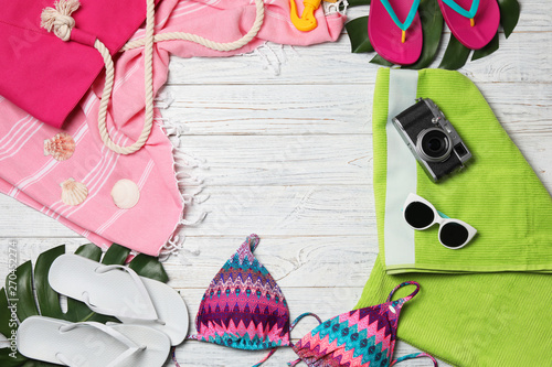 Obraz premium Flat lay composition with swimsuit and beach accessories on wooden...