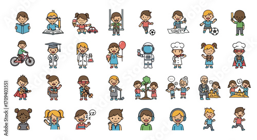 © Vicky, Obraz premium Flat lay illustration of diverse children engaged in various activities, showcasing a cheerful and playful mood against a white background.