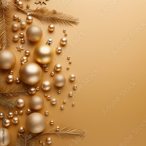 © EveryWeekend, Obraz premium Flat-lay layout Christmas decorations with ornament and baubles. Festive winter background. Space for text.