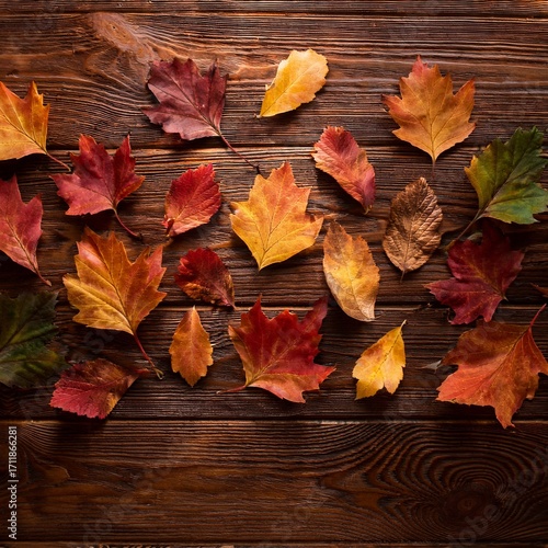 Obraz premium Flat lay of colorful autumn leaves scattered on rustic wooden table, soft...