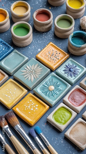 © Lisouski Uladzimir, Naklejka premium Flat-lay of colorful ceramic tiles with intricate handmade glaze patterns