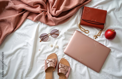 © miss irine, Obraz premium Flat lay of female fashion accessories, digital device on white bedsheet. Woman things as sunglasses jewelry purse laptop apple sandals, pink scarf creating cozy home office workspace. Girl boss