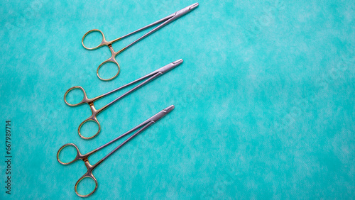 Fototapeta premium Flat lay of Halsey Needle Holder medical instruments. Medical Surgical Instrument. Equipment used in surgery.