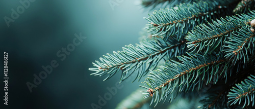 © Svitlana, Fototapeta premium Flat lay of natural fir-tree or spruce on empty background. Minimalist and trendy background. Mock up for winter, holidays, eco-friendly branding. Copy space.Generative ai