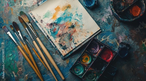 Fototapeta premium Flat lay of paintbrushes, watercolor paints, and an open sketchbook on a textured background, perfect for artistic and creative content