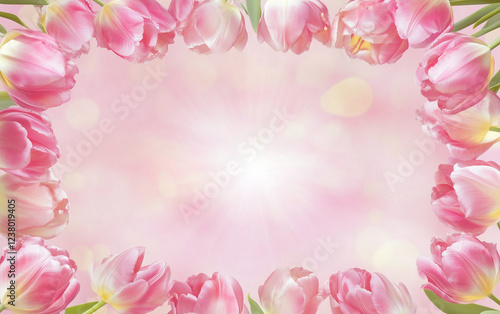 © Harry, Fototapeta premium Flat lay of pink tulips arranged in a border on a light pastel background with copy space