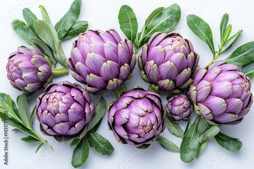 © Georgii, Fototapeta premium Flat lay of purple artichokes and green leaves on a white background