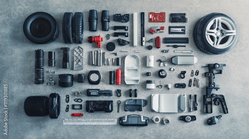© dara, Fototapeta premium Flat lay of repair parts and car necessities on textured background