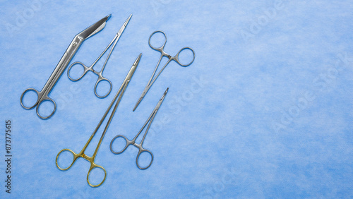 © Mr.Boyz, Fototapeta premium Flat lay of stainless forceps medical scissors placed on a blue background. Medical instruments . Medical Surgical Instrument. Equipment used in surgery.