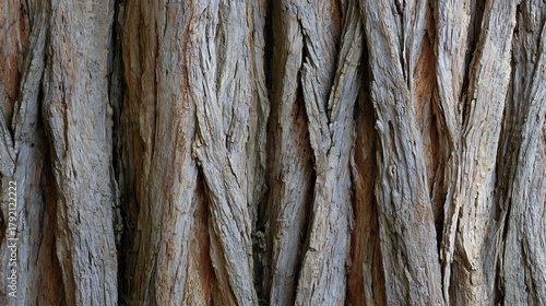 © Bright Bites, Obraz premium Flat lay of vertical cedar tree trunk, bark showing deep vertical ridges and natural gray-brown tones, seamless repeating texture