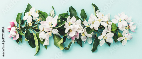 © Natalia Klenova, Fototapeta premium Flat-lay of white apple blossom flowers over light blue background, top view, flat lay