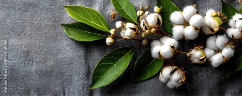 © Georgii, Fototapeta premium Flat lay of white cotton bolls with green leaves on grey fabric background