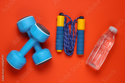 © splitov27, Naklejka premium Flat lay style sport concept. Dumbbells, jump rope, bottle of water. Sports equipment on orange background. Top view