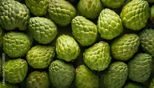 Fototapeta premium Flat Lay Top View of Bright Ripe Fragrant Green Cherimoya Fruit as Background