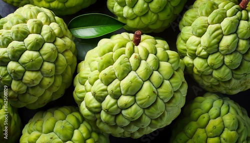 Fototapeta premium Flat Lay Top View of Bright Ripe Fragrant Green Custard apple Fruit as...