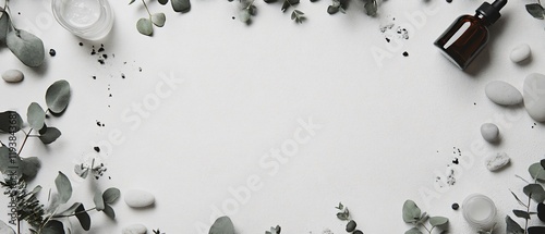 © Rickyloca, Fototapeta premium Flat lay top view of skincare products background frame. Glass dropper bottle, moisturizer jar, eucalyptus leaves, pebbles. Copy space. Generative AI