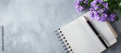 © Gular, Naklejka premium Flat lay with a notebook, a pen, and a purple flower arranged on a gray backdrop, seen from a top view, creating a composition with copy space image.