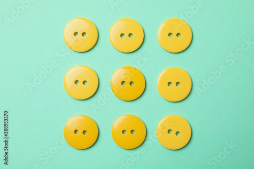 © Atlas, Fototapeta premium Flat lay with yellow buttons on mint background