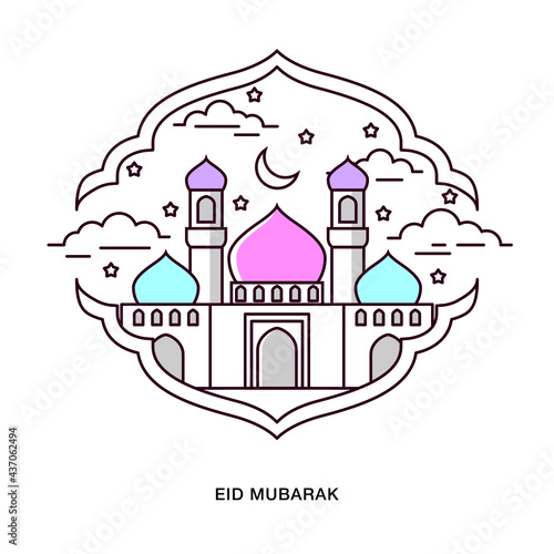 © Rahadhi, Naklejka premium Flat Line Design. Eid Mubarak greeting Mosque illustration inside decoration