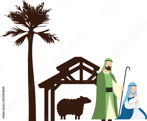 © vectorfusionart, Obraz premium Flat nativity is showing wooden stable, staff, palm tree and sheep silhouettes on transparent bg