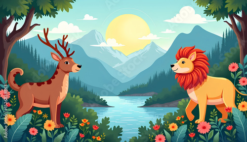 © firma, Fototapeta premium Flat Nature Landscape with Forest Animals