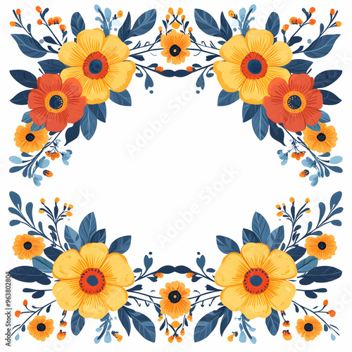Obraz premium Flat Ofrenda and Marigold Flower Border Frame for Dia de Muertos Celebrations - Simple Vector Design with Copy Space for Custom Messages