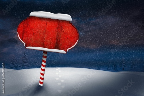 Obraz premium Flat red sign standing on candy-cane pole, footprints toward pine trees amid falling snowflakes