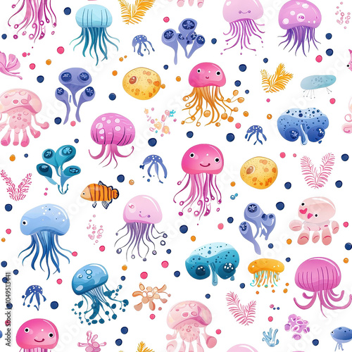 © cloud7days, Naklejka premium Flat style seamless pattern of jellyfish, isolate on white background. PNG