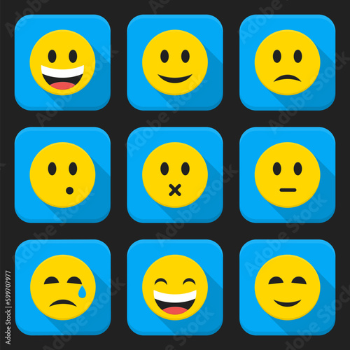 Fototapeta premium Flat style vector illustrations with long shadows; Yellow smiling faces squared app icon set