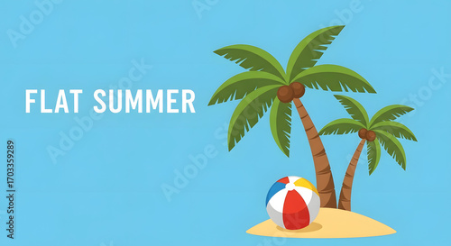 © Jetsada, Fototapeta premium Flat summer with palm trees and a beach ball on a sandy island, representing vacation and leisure