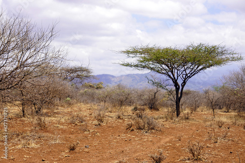 © Gregory, Fototapeta premium Flat-topped acacia during dry season with mountains in the background