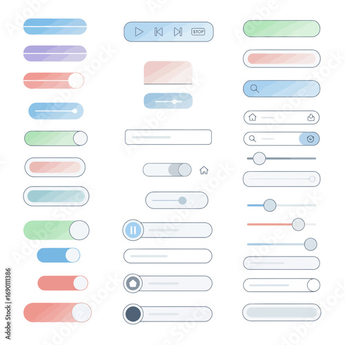 Obraz premium Flat UI buttons and web elements vector pack. Clean lines, soft pastel gradients, rounded shapes. Modular & high-resolution design