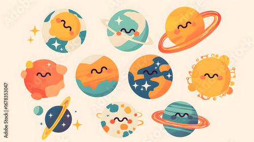 Fototapeta premium flat vector comic style cute smiling planets
