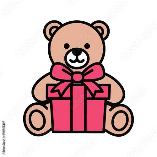 © Arya, Obraz premium flat vector Cute teddy bear with gift box and pink bow