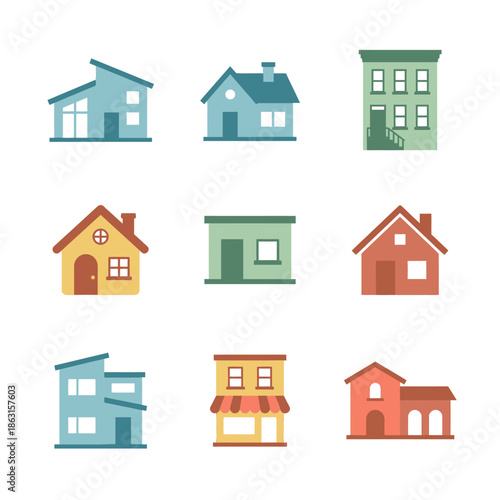 Fototapeta premium Flat Vector Houses in a 3x3 Grid Layout