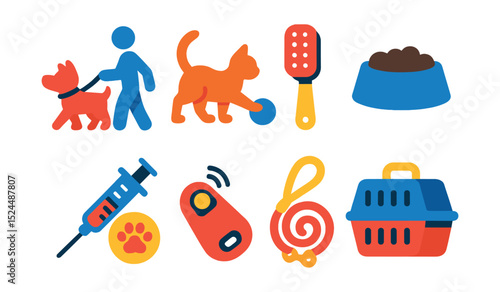 Fototapeta premium Flat vector icons of pet activities: dog walking, cat playing, grooming brush, feeding bowl, pet vaccination, training clicker, leash, pet carrier.